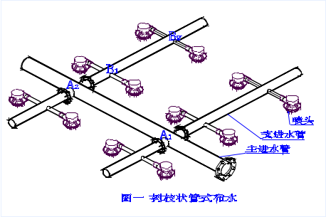 逆流冷卻塔循環(huán)水系統(tǒng)的布水方式采用管式布水,呈樹枝狀,循環(huán)水先進(jìn)入主管,然后進(jìn)入支管,再進(jìn)入噴頭,主管、支管、噴頭相互垂直,如圖一。根據(jù)流體狀態(tài)方程:壓力(P×流速(V)=常數(shù)(K),循環(huán)水從主管流經(jīng)A1點(diǎn)、A2點(diǎn)后,到達(dá)主管末端,由于冷卻塔布水需要主管末端是封閉的,因此流速(V)急劇下降,壓力(P)急劇上升,所以A2處比A1處水壓頭大,同理B2處比B1處水壓頭大,綜上分析各布水噴頭處的水壓頭不相
