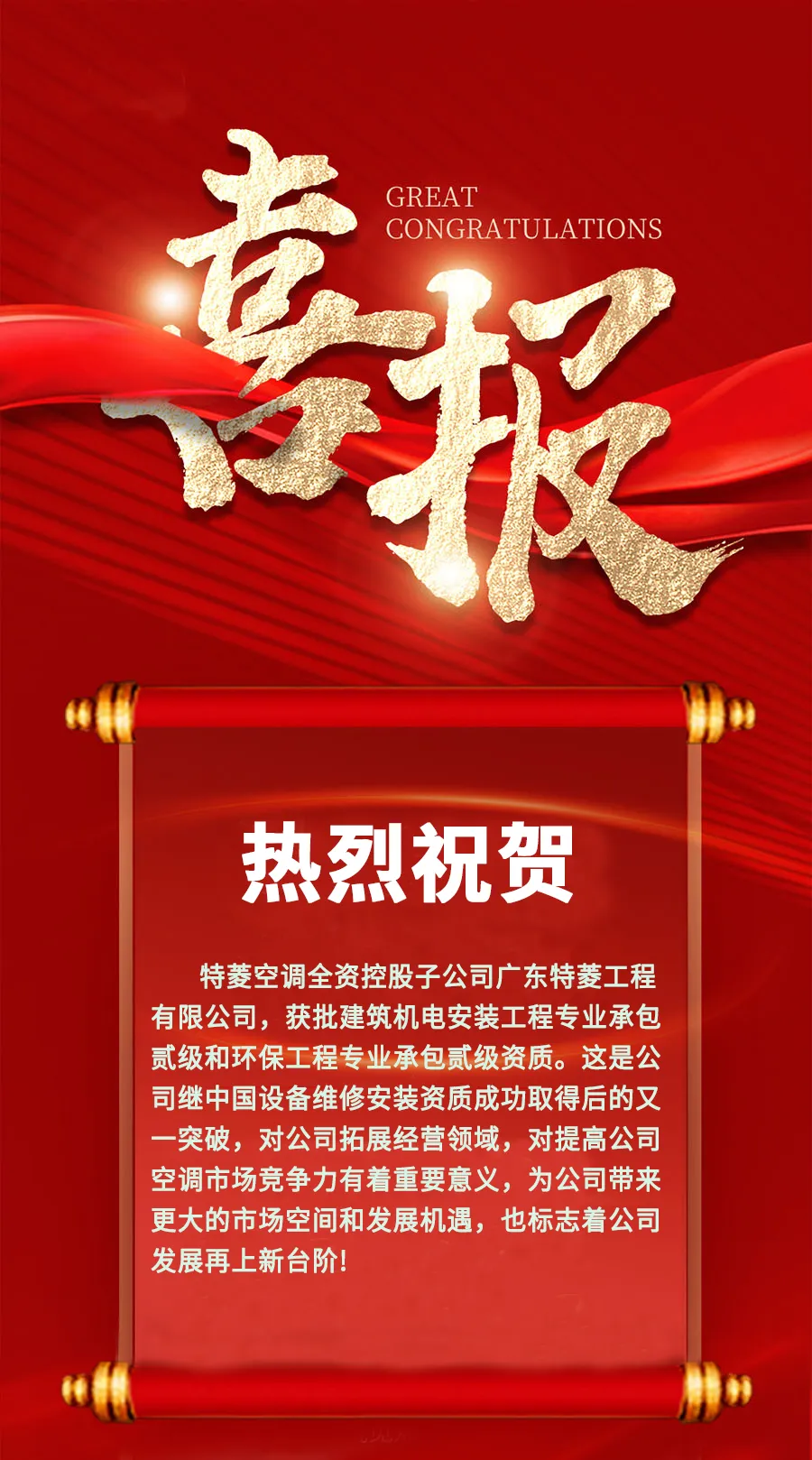 喜報!特菱空調全資控股子公司廣東特菱工程有限公司獲批